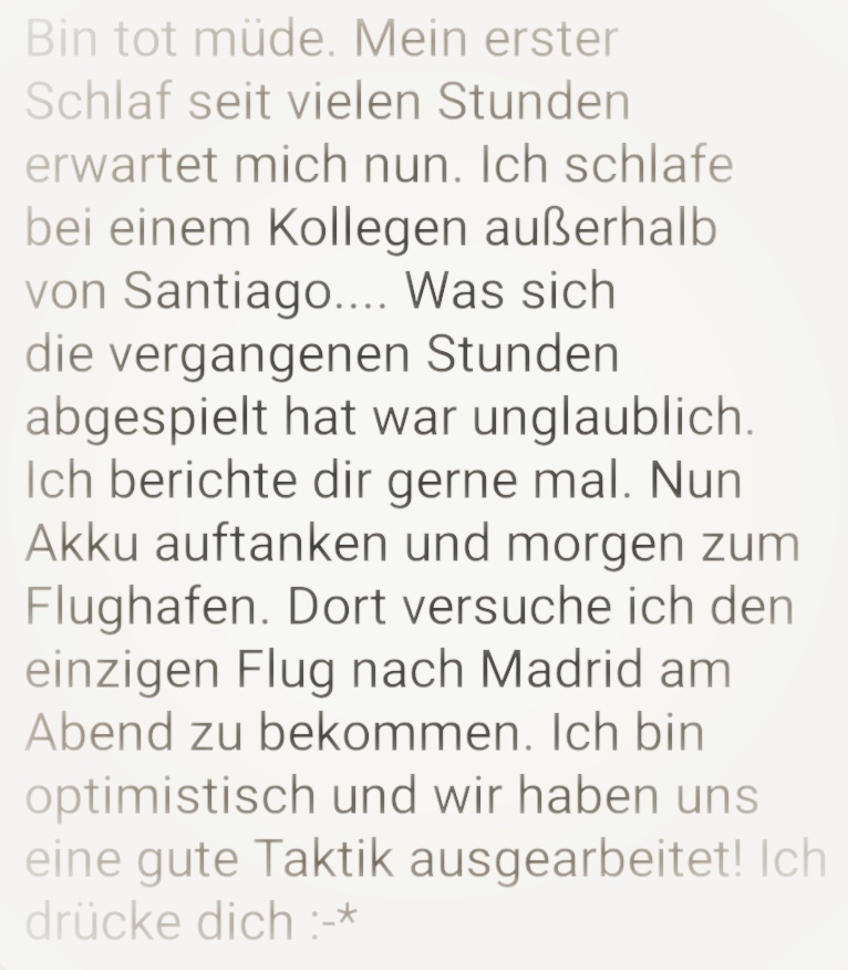 Zwei Wochen vergehen. Ich erhalte eine Email von dem ausgeschriebenem Rückholprogramm. Es wird geraten sich in Santiago zu befinden. Jedoch ist die Rückholung nur auf eine bestimmte Anzahl von Menschen beschränkt. Eine Heimkehr ist somit nicht gewährt.