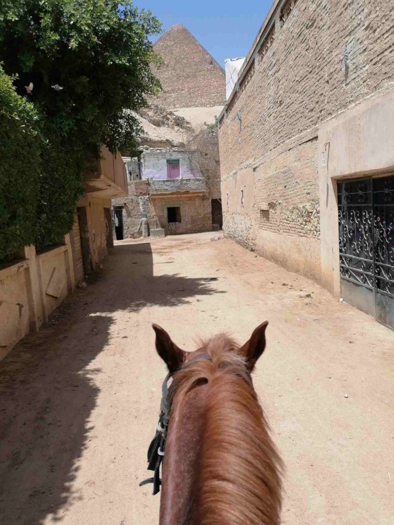 I ride a horse into the desert. With a cup of tea I enjoy the peace and the view of the pyramids. The panorama of the big city recedes into the background.